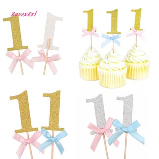 Xa 10pcs Sparkling 1st Birthday Ribbon Bow Cupcake Topper Baby
